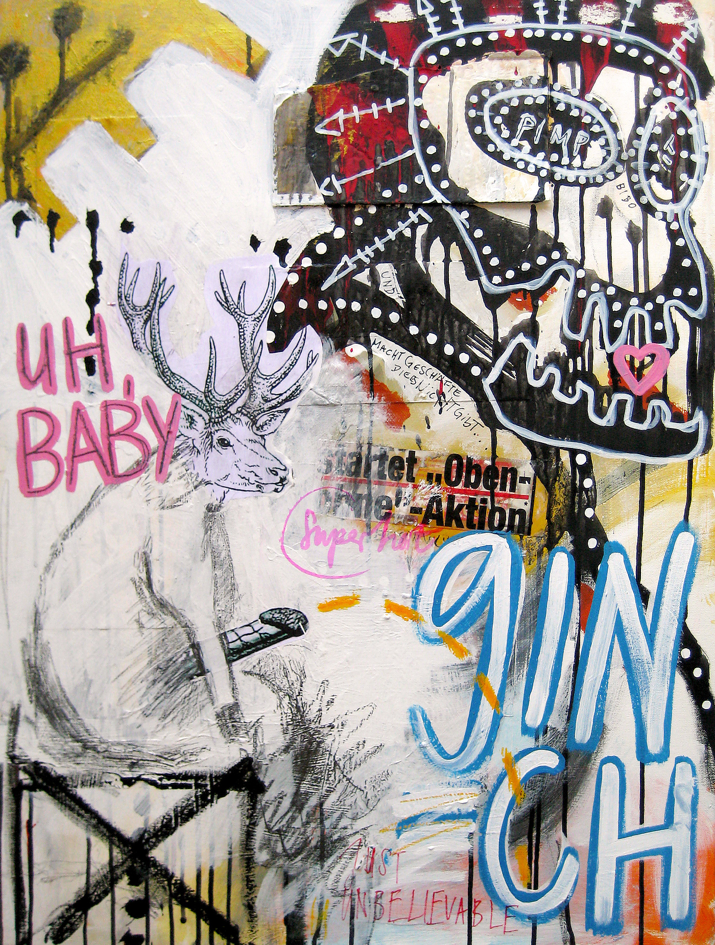 The collaboration with the artist Markus Giltjes (bobok) started in 2006. Together we worked on 21 images - each one exchanged about five times. Acrylic color, marker, spray paint, paper, glue and some other material on canvas. Preview with a selection of 8 paintings.